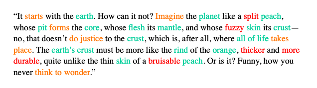 This paragraph is filled with nouns and active verbs, which are the core of expressive language. With a little bit of connective tissue (prepositions, pronouns, articles, etc.), those nouns and verbs combine into a beautiful image of our planet as a peach.