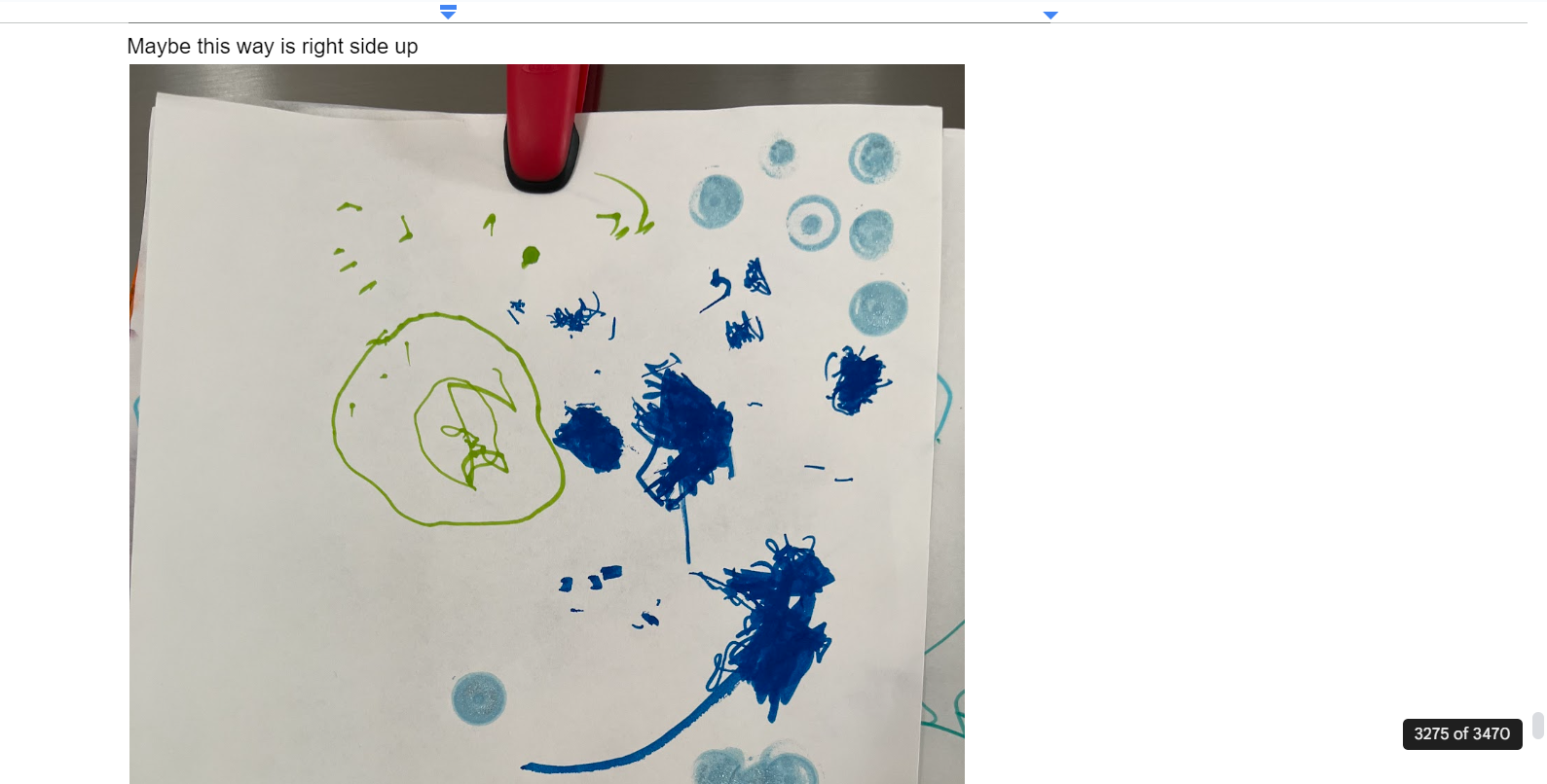 I skimmed the 3,000+ pages of my Google Doc journal for an example, and here is one screengrab that didn’t feel too personal to share. It’s of a drawing my daughter made when she was 3, which, to me, looks like a blue dragon soaring in front of the moon and stars (once I figured out how it might want to be oriented).