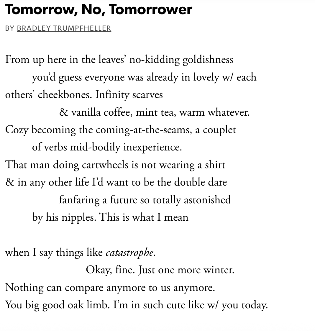 Poetry Recommendation: “Tomorrow, No, Tomorrower” by Bradley Trumpfheller