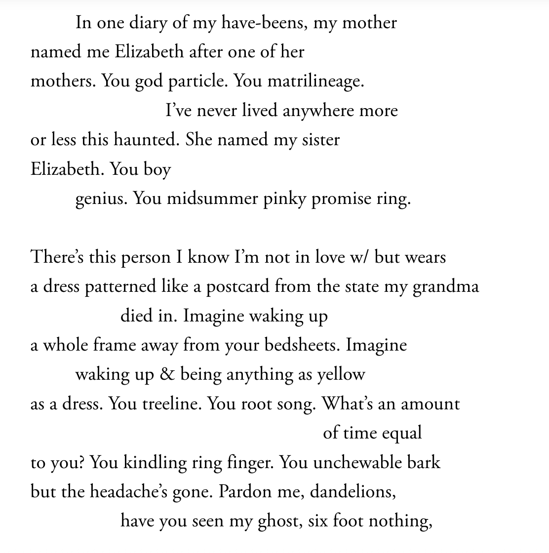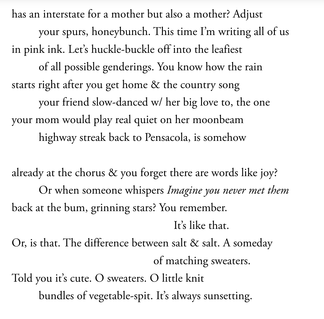 What these dynamics of language and form produce is a poem that excavates joy out of trauma. The speaker explores their relationship with their mother, their journeys of gender and selfhood, their haunted past and the groundwork it lays for their bright and gorgeous future. I love the poem’s emphasis on joy and wonder throughout. In treating every word as an opportunity for play, we end up with delicious, brilliant turns of phrase like “Hurry up & sunspot, daylilies!” or “C’mon rapture. Let’s go bedazzling.”