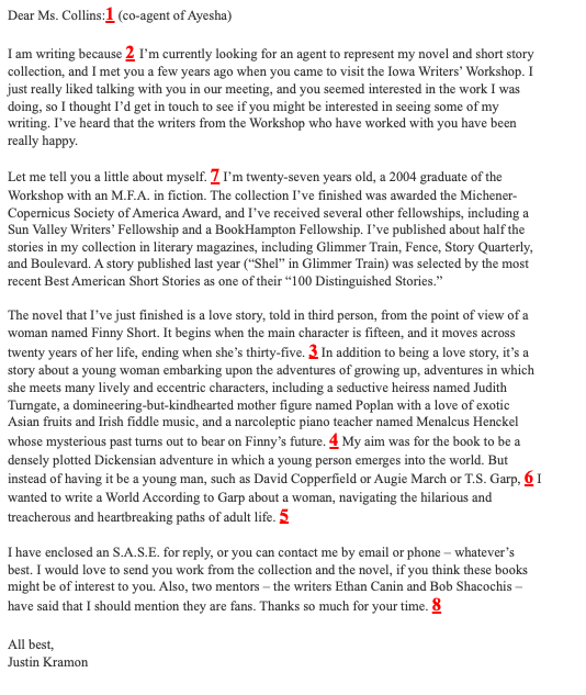 You’ll notice that Justin doesn’t include all of the steps in order, but by the end of the letter, the reader has a sense of his writing style, his potential readers, his literary influences, and the connections he has that can help him market his book.