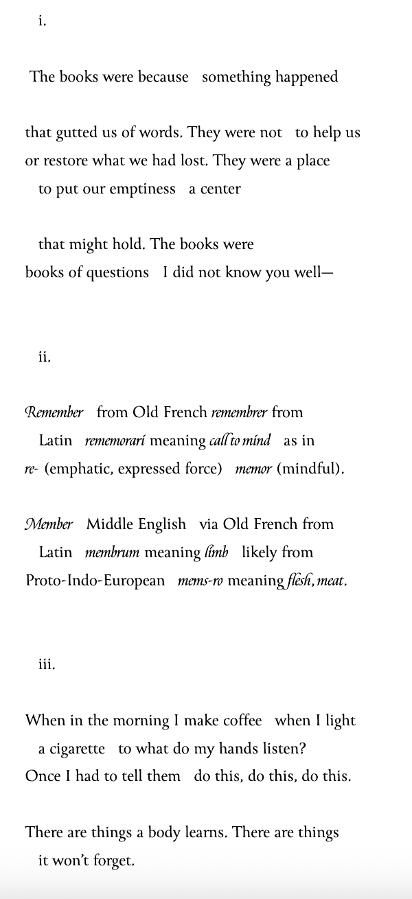 This is certainly a modern take on the genre, but no less interesting. What does it mean when the topic of lament occurs at the edges? When the reader doesn’t know what the topic is, but still feels its presence haunting the language? I can’t say—I only know that, when a source of grief cannot be looked at directly, what emerges from the peripheries is no less gutting.