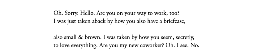 The speaker’s tone could be described as both “meek” and “searching.” Words like “oh” and “sorry” reveal the speaker’s immediate disquietude, especially since he describes himself as “taken aback.” Despite this, he tries to make a connection with the non-coworker, commenting on details that one wouldn’t usually discuss with a stranger. Imagine a stranger saying these two couplets to you: does he sound confident and self-assured, or hesitant and self-conscious?