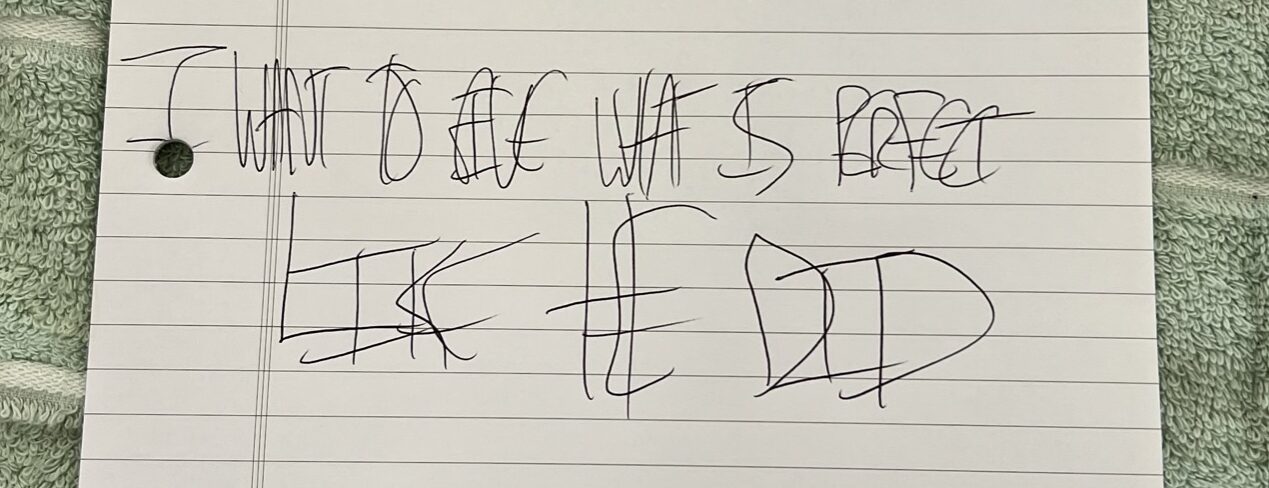 This reads, “I WANT TO GIVE WHAT IS PERFECT LIKE HE DID”