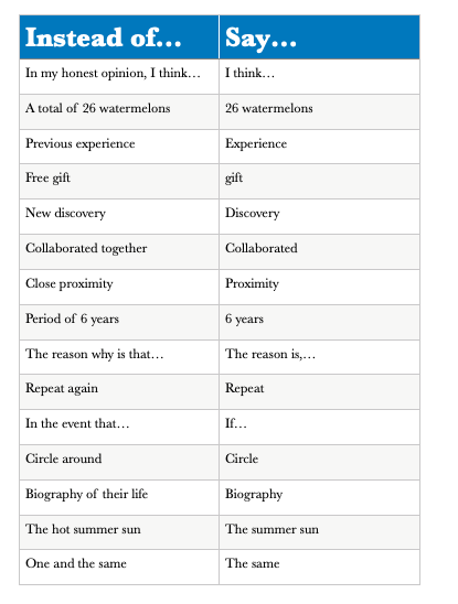 We also let redundancies slip when relying on colloquial turns-of-phrase. A lot of the phrases we use in English are redundant, especially transition statements and verbal colloquialisms. To give you an example, the chart below lists common English phrases on the left, with concise synonyms on the right. You may use these redundant colloquialisms in dialogue, but we recommend almost never using them in poetry or the narration of prose.