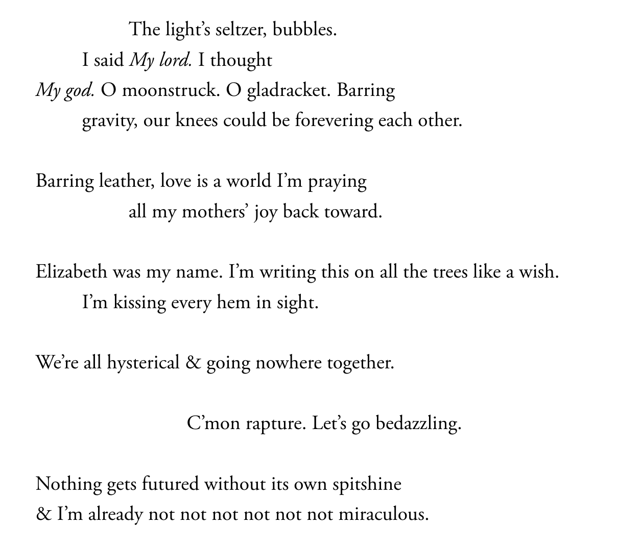 What these dynamics of language and form produce is a poem that excavates joy out of trauma. The speaker explores their relationship with their mother, their journeys of gender and selfhood, their haunted past and the groundwork it lays for their bright and gorgeous future. I love the poem’s emphasis on joy and wonder throughout. In treating every word as an opportunity for play, we end up with delicious, brilliant turns of phrase like “Hurry up & sunspot, daylilies!” or “C’mon rapture. Let’s go bedazzling.”