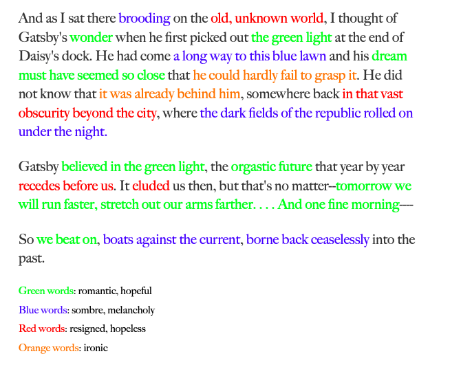Take a look at the highlighted words, as well as the opposition between different highlights. F. Scott Fitzgerald juxtaposes many different emotions in this short, poignant passage, resulting in an ambivalent yet powerful musing on the passage of time. By focusing the diction of this passage on emotions both hopeful and hopeless, Fitzgerald masterfully closes one of the most important American novels.