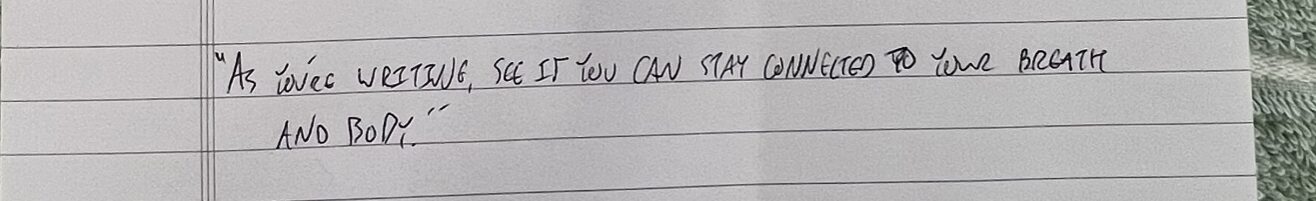Here’s more detail on that same advice from a later workshop I attended with her: “When we’re writing we often disconnect from our body; see if you can stay connected to your body and your breath as you write, so you’re not just writing from your head, but from lower down.”