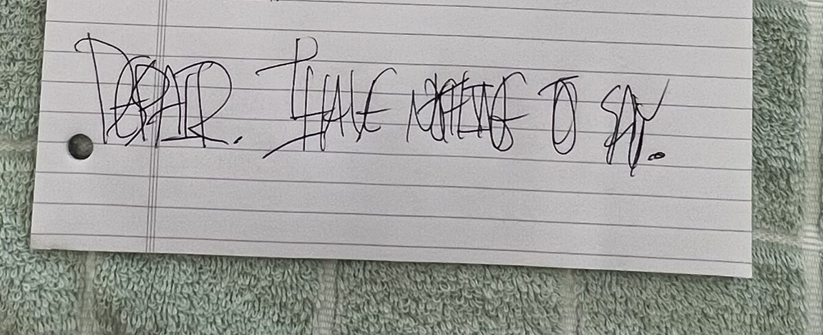 That agonized handwriting (getting to emote in your handwriting is a big benefit of freehand writing) reads “DESPAIR. I HAVE NOTHING TO SAY.”